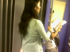 The newest addition to my STAR LRT celebrity member is Princess XX. Aptly named so because she is the epitome of femininity. The XX sex chromosome. She is the Puteri Lilin of legend. The damsel in distress. A fragile flower petal. The moment she enters the train, she will glide to the handrail and cling to it-- barely. As if the lightest of secret farts from nearby passengers can dislodge her from her place. She rests her weight on one foot. She lightly bends her leg and cocks her head to one side, letting her curls dangle. She looks up with hooded eyes, bedroom eyes. She pouts. Ever in the most feminine of dresses (perhaps she buys XXL at "Little Princess" outlets?). Strappy dresses (often the bellpepper variety! ) with a cardigan over. Sometimes a giant bow on her bosom. Her dainty feet are always in shoes fit for a ballerina. Crystal bracelets crawl up both her forearms. I wonder if she stirs interest in the men who share the train with her? Would men rush out to protect her from the crushing crowds of rush hour traffic or will she just be trampled to a pulp, her gentle cries of help drowned out by the din of the train? Until the next sighting...